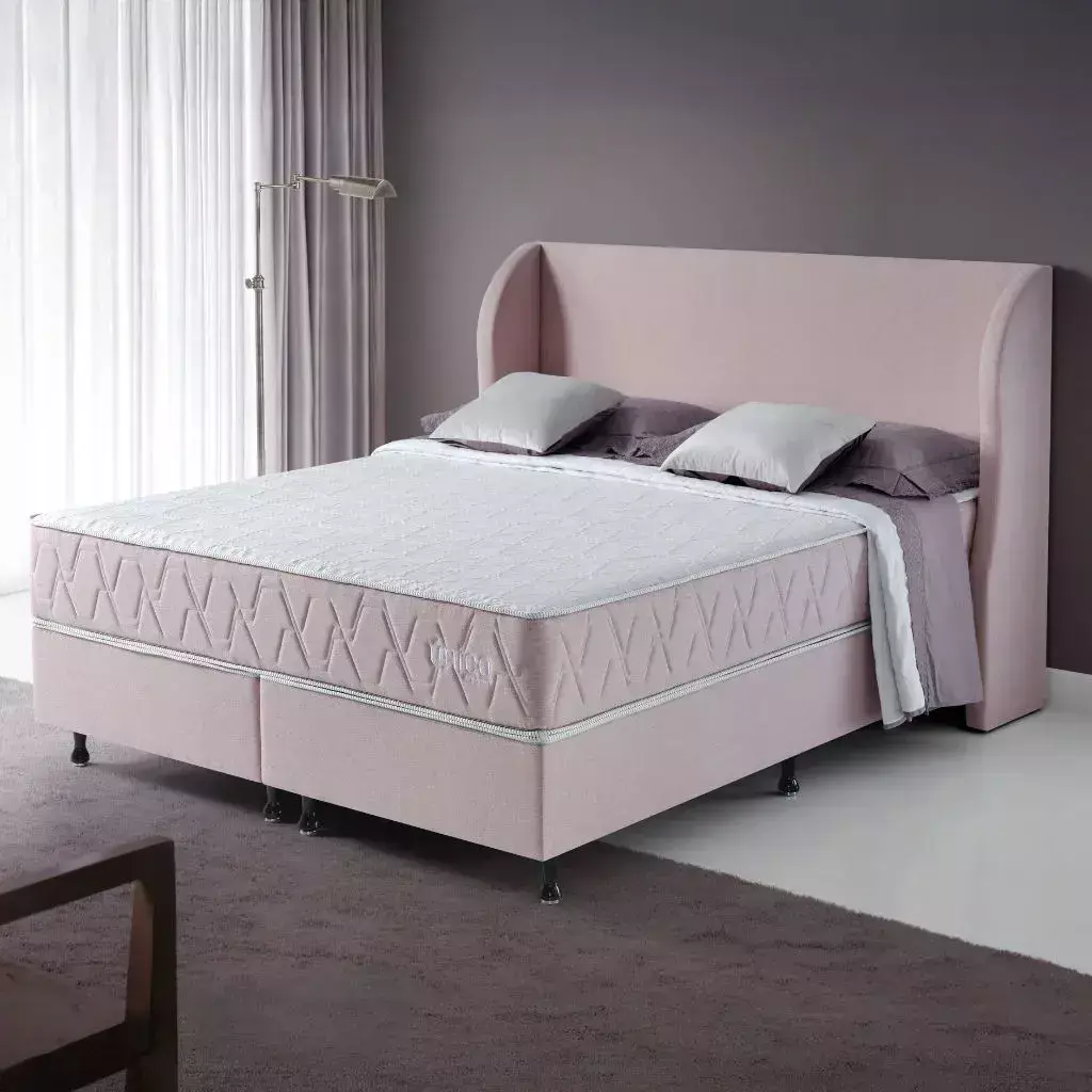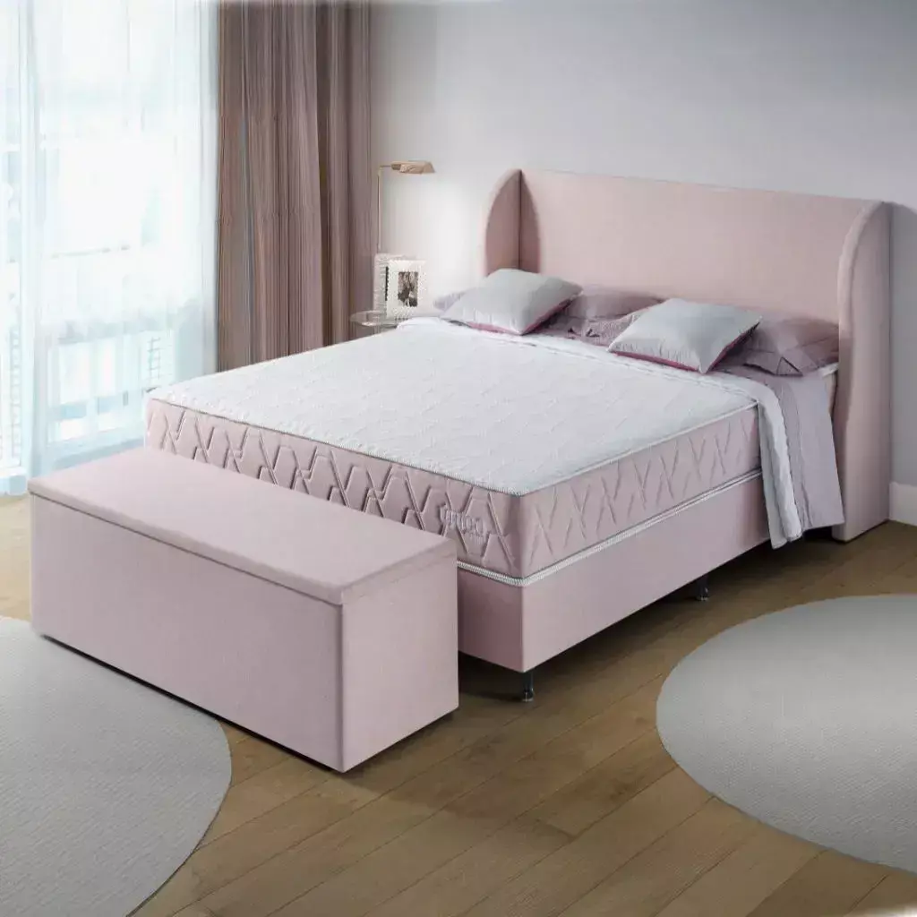 Arquitetura 100% espuma com quatro densidades para alinhamento anatômico, redução de pontos de pressão e maciez controlada.